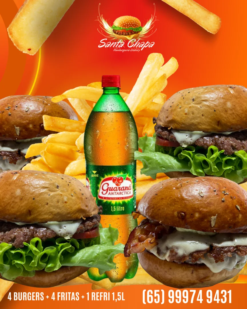 4 Lanches (escolha entre x salada, x bacon ou x burger) + 4 batata frita de 100g P + 1 Guaraná 1,5L