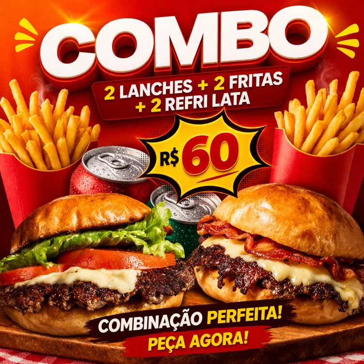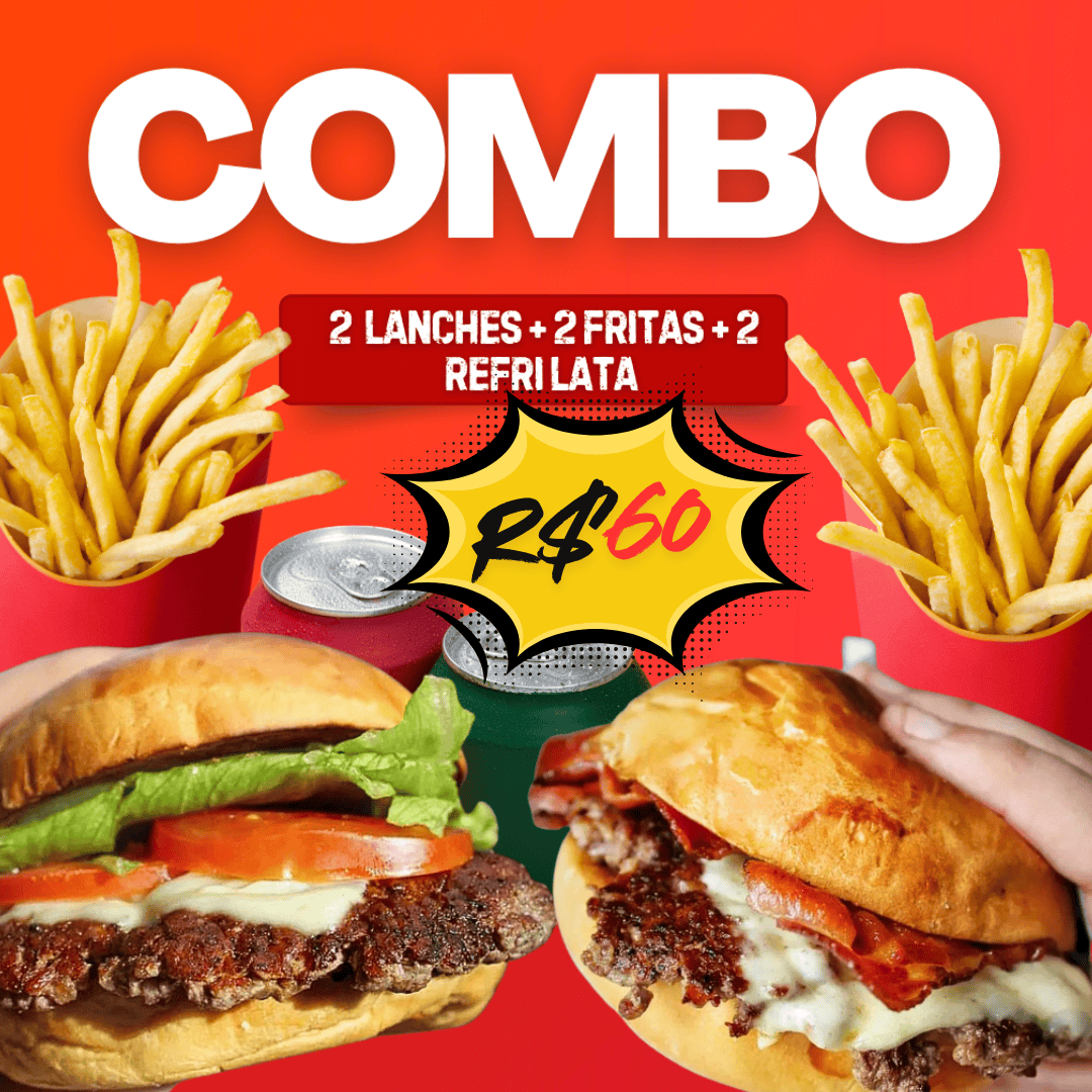2 Lanches (escolha entre x salada, x bacon ou x burger) + 2 batata frita de 100g P + 2 Guaraná Lata